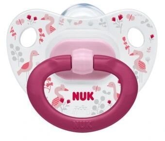 Silikonowy smoczek uspokajający NUK Classic Happy Days 0-6 miesięcy 1 szt./pud. ulepszony anatomiczny kształt NUK – wzorowany na kształcie brodawki sutkowej matki w czasie karmienia piersią, optymalnie dostosowuje się do jamy ustnej dziecka w czasie ssania cieńsza i węższa...
