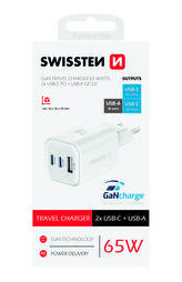 SWISSTEN SÍŤOVÝ ADAPTÉR GaN 2x USB-C 65W PD + 1x USB-A 18W QC BÍLÝ