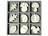Dřevěné ozdoby v boxu 45ks - podzim - 9 motivů po 5 ks, rozměr motivu: 3x3cm.