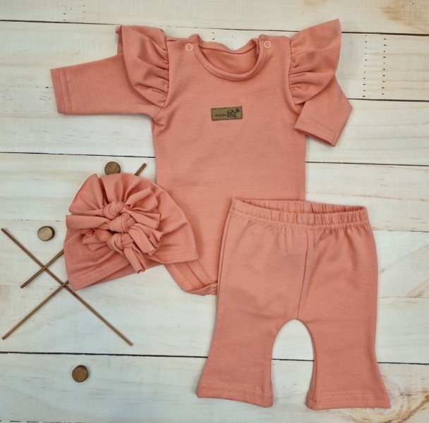 Body s volánky, legíny do zvonu a čepička, 3D, bavlna, meruňková, vel. 74; 74 (6-9m)