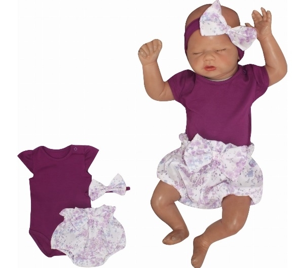 Z&Z 3-dílná sada body kr. rukáv, kraťásky, čelenka s mašlí - fialová, bílá, vel. 86; 86 (12-18m)