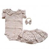 Mušelínová sukničkokraťásky, bodýčko a čelenka, 3D sada, béžová/dots; 56/62