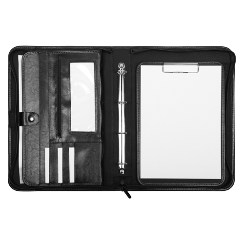 Portfólio se zapínaním na zip, s vnitřními přepážkami na dokumenty, s 4-kroužkovou mechanikou a s vydělávací deskou, vyrobené z materiálu koženka/textil, dodávané v černém provedení. Rozměr 280x210x40 mm číst celé