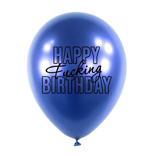 Sada chromových balonků s potiskem Happy Fu.king Birthday v modré barvě. Balonky se díky svému nápisu hodí na vtipnou oslavu narozenin pro dospělého. Balení obsahuje 5 kusů potištěných 30 cm balonků, které jsou vhodné na nafukování heliem i vzduchem.