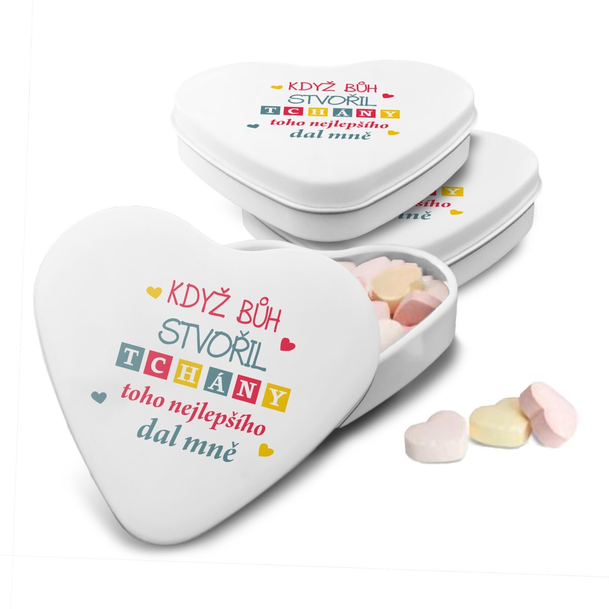 Bonbónky v srdíčkové krabičce s originálním motivemBonbónky jsou malým dárečkem pro potěšení a je vhodné darovat je jako doplněk s jiným dárkem z našeho e-shopu nebo v dárkové krabičce s ostatními produkty.Udělejte radost malým dárkem do kapsy, sladkými bonbóny v kovové krabičce ve tvaru srdce....