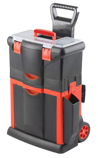 Plastový pojízdný kufr, tažná rukojeť 460x330x660mm s 1x zásuvkou Pojízdný kufr s organizérem ve víku a držákem pro objemné nářadí. číst celé