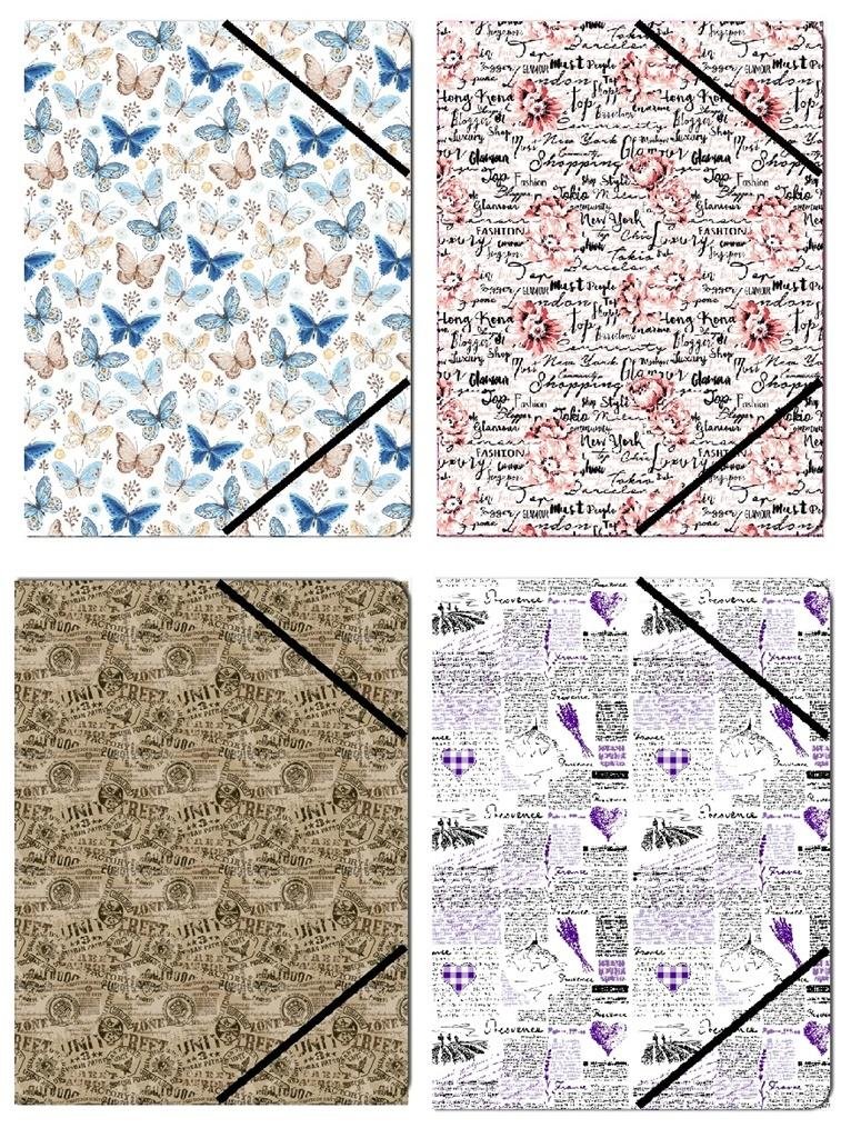 Ozdobna teczka na dokumenty formatu A4, zamykana na gumkę. Dostępna w czterech wzorach.Wzór wysyłany losowo. číst celé
