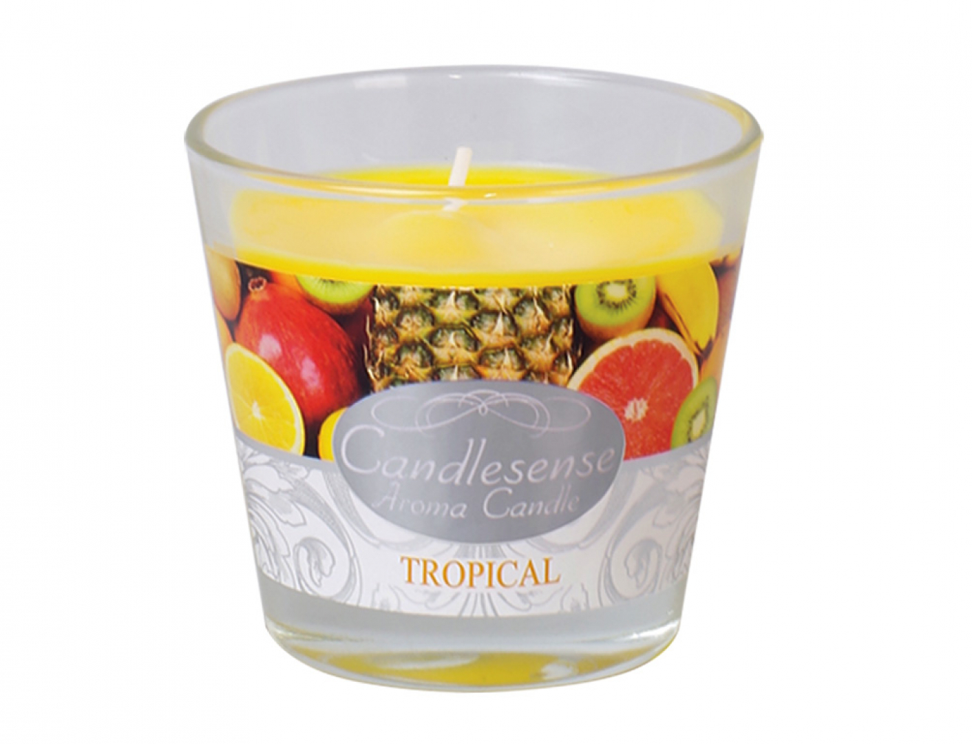 Vonná svíčka ve skle. Sklenice má kónický tvar a etiketu s motivem vůně svíčky. Voní po tropickém ovoci. Zpříjemní atmosféru v každém interiéru. Hmotnost náplně: 140 g. Doba hoření: 26 hodin. Barva: žlutá. číst celé