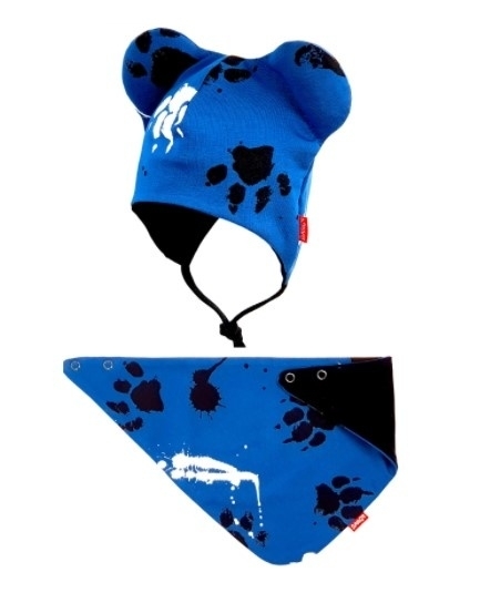 Bexa dvouvrstvá čepice na zavazování s oušky + šátek - Tlapky, granát