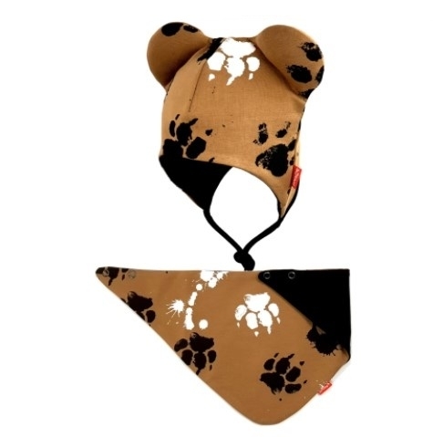 Bexa dvouvrstvá čepice na zavazování s oušky + šátek - Tlapky, hnědá, vel. 80/92