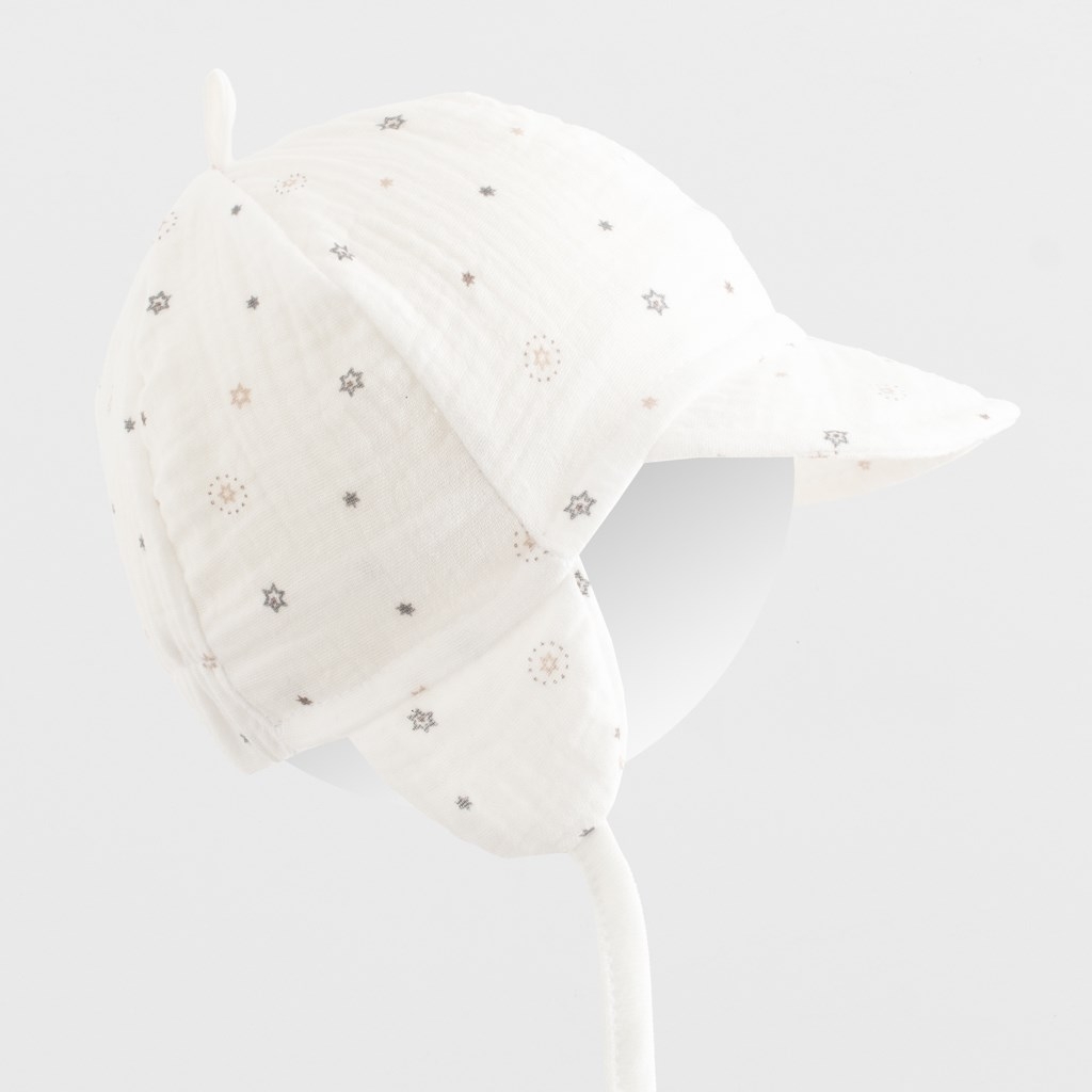 Letní mušelínová čepička s kšiltem české značky New Baby Arthur. Čepička ochrání hlavičku před prudkým sluncem a díky kšiltu, který udělá stín nespálí tvářičku a chrání oči dítěte před sluncem. Je krásně tvarovaná na ouška, zavazuje se na tkaničky, netlačí a bude dobře držet na hlavičce miminka....