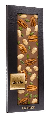Mléčná čokoláda s mandlemi, pekanovými ořechy a pistáciemi z Bronte