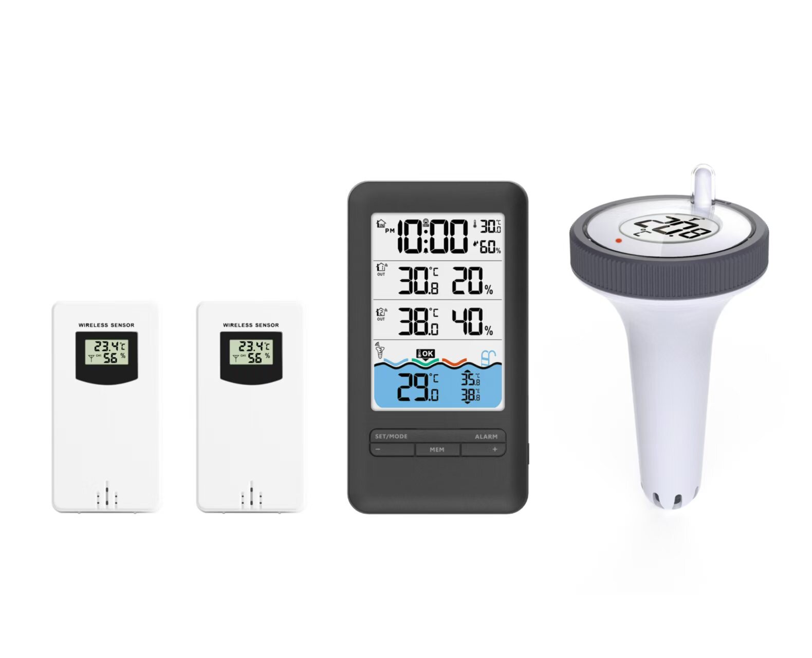 - Obsah balení: vnitřní stanice, 1× bazénové čidlo, 2× vnitřní čidlo, napájecí kabel, uživatelský manuál