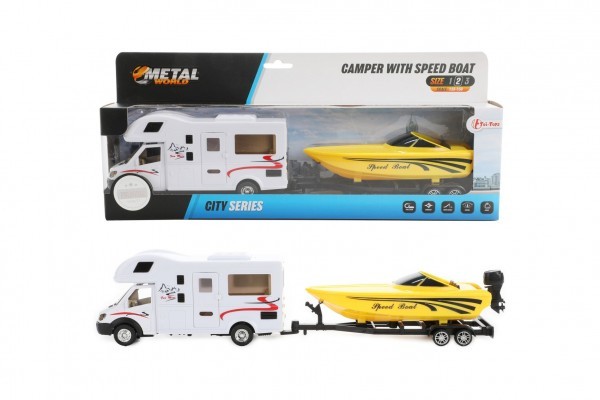 Auto obytné se člunem kov/plast 34cm na zpětné natažení v krabičce 36x15,5x6cm