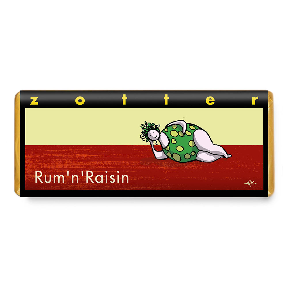 Poctivá bio mléčná čokoláda s vysokými 60 % kvalitního fair trade kakaa ručně plněná lehkou čokoládovou ganache (52 %) s řádnou dávkou rumu Ron Johan Rum a hrozinek (8 %). Hrozinky se nejdříve máčí v rumu, později najemno nasekají a zvýrazní karamelizovanou rumovou chuť krému. Rum destiluje pan...