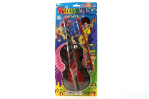 Plastové housličky se smičcem na dvě AA baterie. Při kontaktu smičce se strunama hrají písničku a svítí. Věk 3+ číst celé