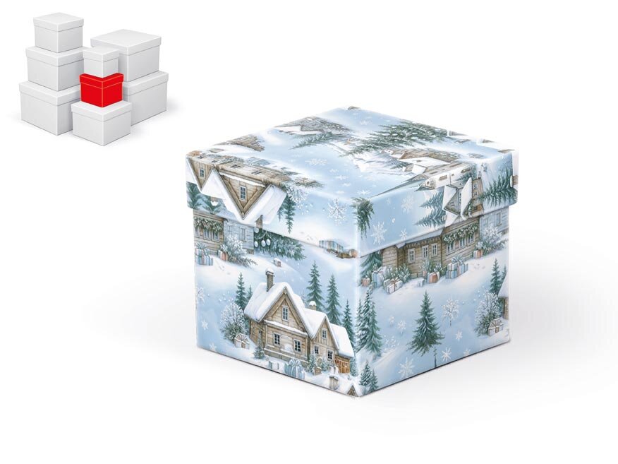 Vánoční dárková krabice o rozměrech 10 x10 x 9 cmKrabička s nostalgickým motivem zasněžené vesničky, stromky a jemnými sněhovými vločkami vnese do balení kouzelnou atmosféru zimních Vánoc. Je jako stvořená pro menší pozornosti – šperky, sladkosti, svíčky či drobné dekorace. Díky pevnému provedení...