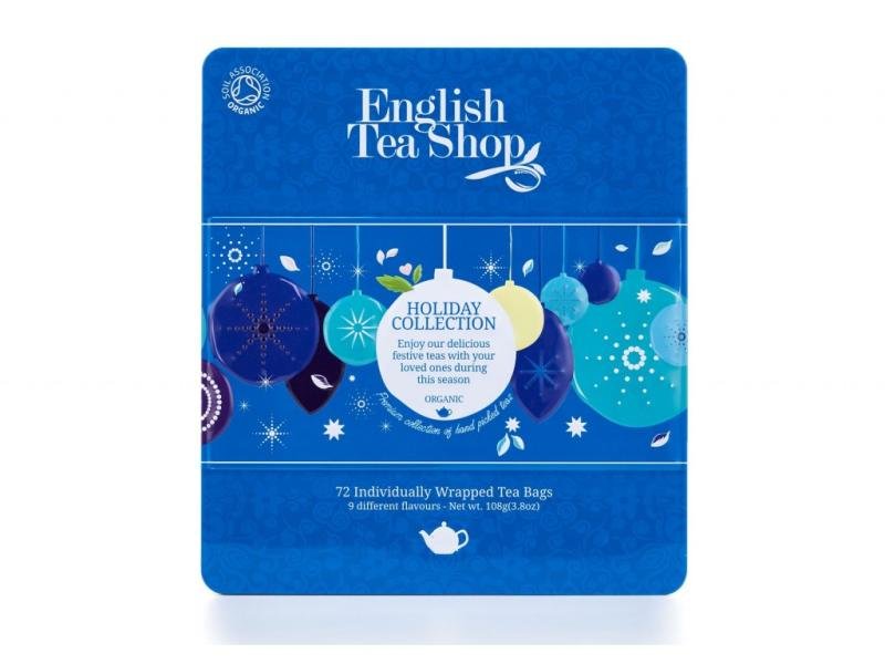 English Tea Shop Prémiová dárková plechová kazeta s bio čaji modré ozdoby108 g,72 ks