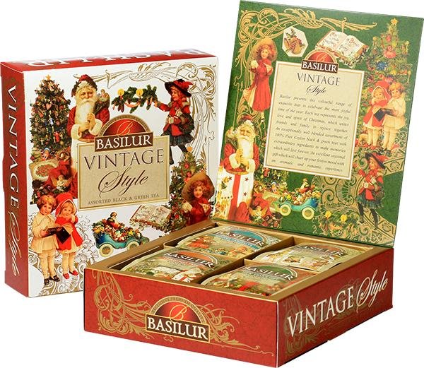 Dárková kolekce BASILUR Vintage obsahuje pečlivě vybrané sáčky černých i zelených čajů, každý s unikátní, sváteční příchutí. Vychutnejte si zimní svátky s Winter Holidays, kombinující černý čaj s jemnou vanilkou, jahodou a smetanou. Příjemně pikantní Merry Christmas vás nadchne zázvorem, citronem, medem a vanilkou. Osvěžující Christmas Tree přináší zelený čaj s exotickým aroma manga, mučenky a limetky. A na oslavu příchodu Nového roku je tu New Year´s Gift - černý čaj s jedinečnou kombinací třešně a mandlí.