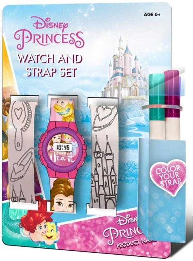 Księżniczki Disneya, Zegarek Elektroniczny Plus Dwa Paski Do Malowania. Oryginalny zegarek elektroniczny Disneya z wizerunkami Księżniczek. Zegarek posiada tarczę elektroniczną oraz mechanizm kwarcowy zasilany pojedynczą baterią. Zestaw składa się z cyfrowego zegarka z regulacją, na barwnym...