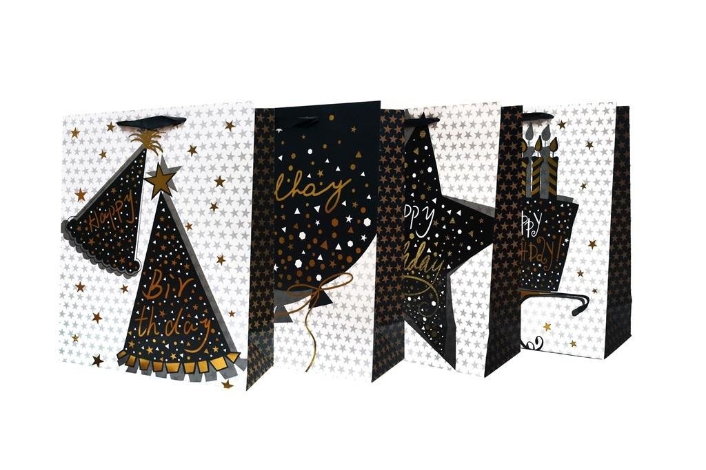 Mix wzorów, towar wysyłany losowo.Torebka ozdobna, pionowa, o wymiarach 26x32x10,5 cm. Dostępna w 4 czarno-białych wzorach z metalizowanymi akcentami. Zamiast sznurka znajduje się czarna, ozdobna wstążeczka. Posiada wzmacniany spód. číst celé