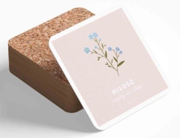 Podstawka korkowa pod kubek o wymiarach 10cm x 10cm.Podstawka zawiera tekst:Miłość nigdy nie ustaje.1 Kor 13,8 číst celé