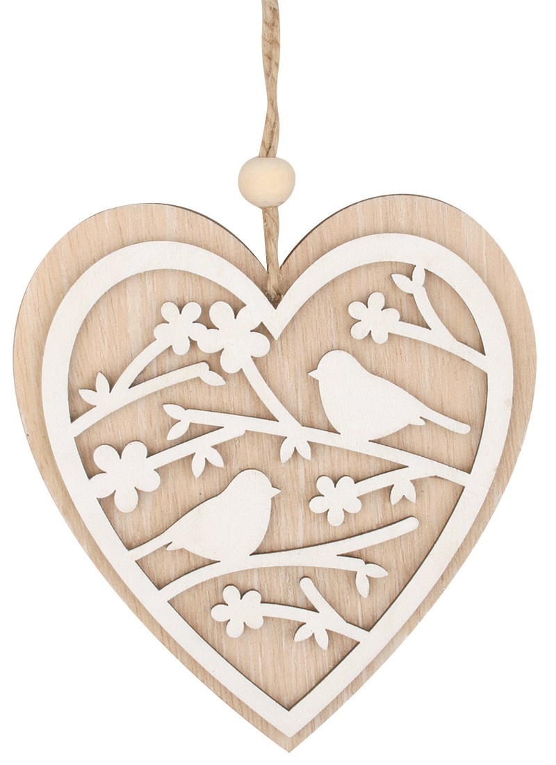 Srdíčko dřevěné s ptáčky k zavěšení 12 cm