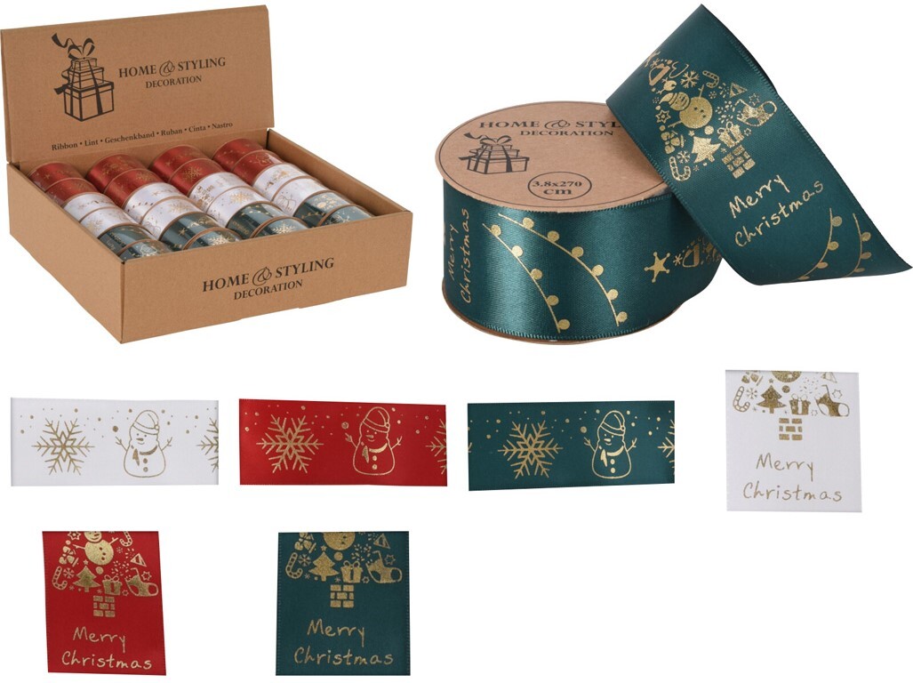 Stuha 2700x38mm potisk zlatý vánoční motivy box mix, červená, zelená, bílá