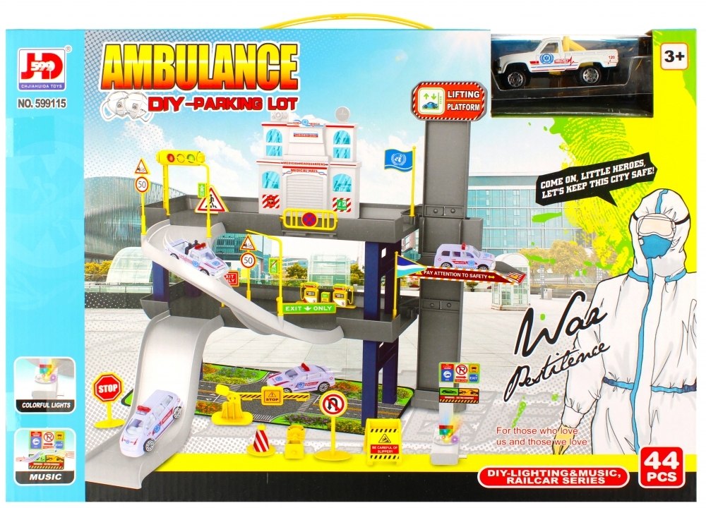 Zalety produktu: parking posiada efekty świetlne oraz dźwiękowe, rozwija kreatywność dziecka, parking 44 elementów Szpital z akcesoriami. Aby utrzymać ład parkowania samochodów i pojazdów ratunkowych każdy szpital musi posiadać parkingi dla swoich aut oraz aut którymi przyjeżdżamy do szpitala....