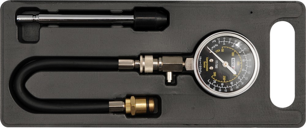 Profesionální sada pro měření kompresního tlaku spalovacích motorů. Zařízení se umístí místo zapalovací svíčky motoru a určí se tlak pro daný válec. Sada je opatřena nástavcem s gumovým zakončením a také hadičkou se zakončením se závitem pro montáž u motorů s hluboko zapuštěnými svíčkami. Délka...