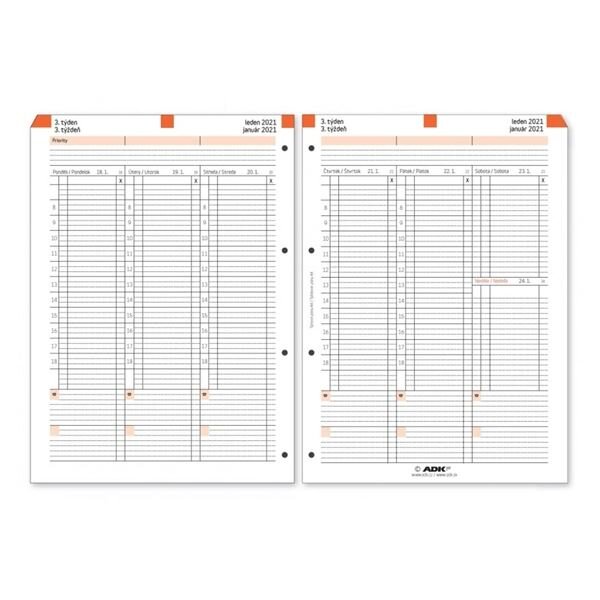 Termínovaný formulář pro týdenní plánování do diářů ADK formátu A4;Celý týden na jeden pohled;Dny řazené do sloupců;Levá strana od mechaniky: pondělí – středa;Pravá strana od mechaniky: čtvrtek – neděle;Rozměry 29,5 x 21 cm číst celé