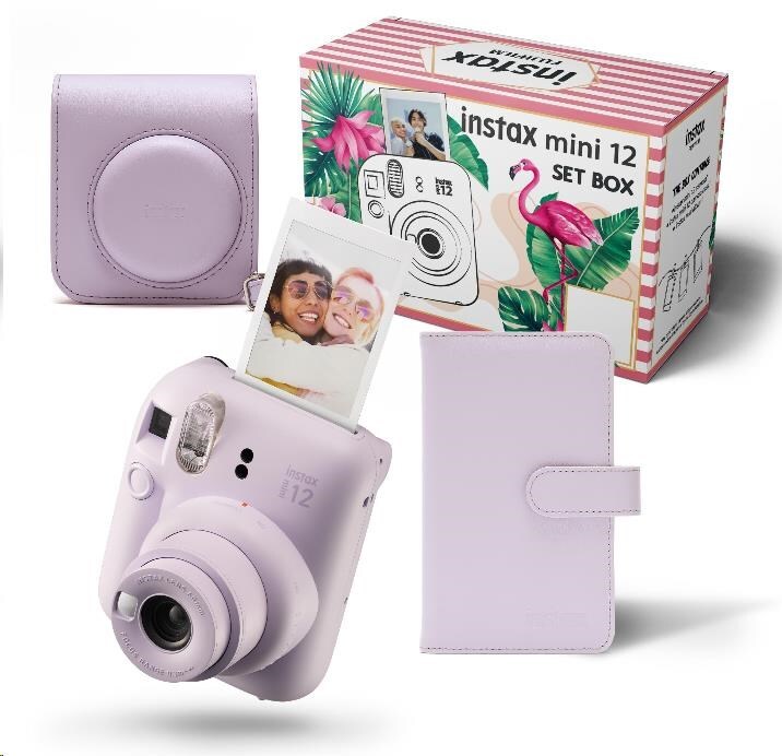 - Balení obsahuje: fotoaparát INSTAX mini 12, 2x baterie AA, popruh na zápěstí, pouzdro s popruhem, album na 108 fotografií