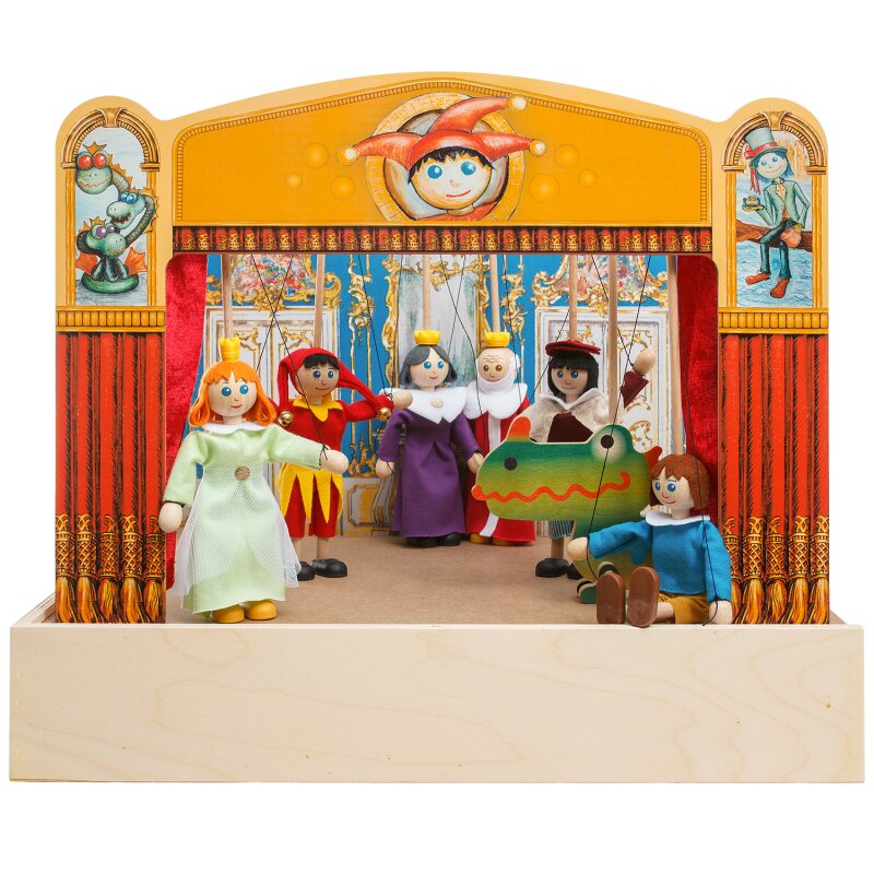 Jsem precizně vyrobené dřevěné loutkové divadlo určené pro 15 -25 cm loutky, ty si u mě můžou zvesela hrát, mají dostatek místa a jsou celé vidět. V praktickém kufříku mě přenesete kamkoliv a během minuty může představení začít!V kufříku o velikkosti 40x45x8 cm se nachází:7 loutek velikosti 14 cm...