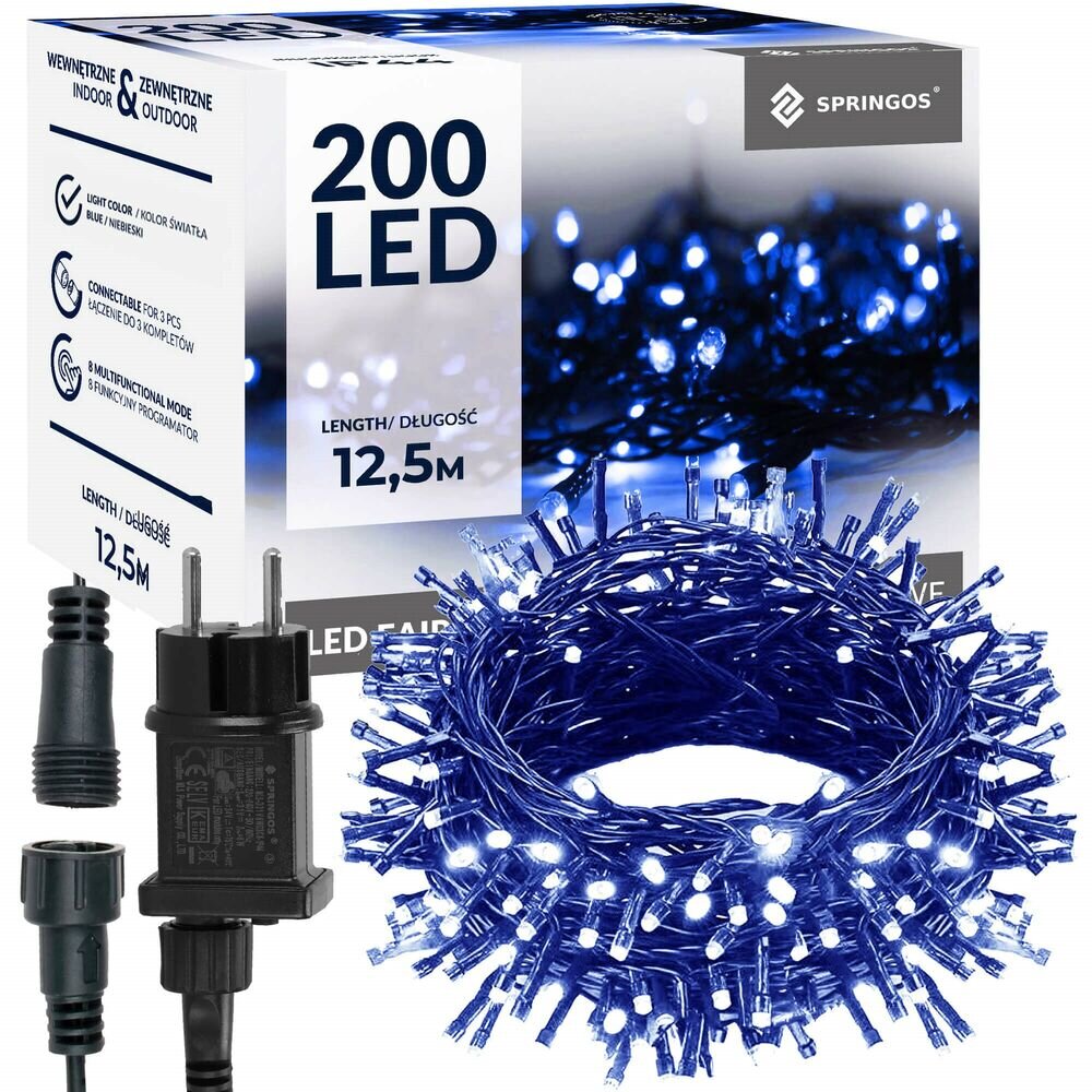 LED světelný řetěz s programátorem a 8 světelnými funkcemi včetně efektu záblesku. Adaptér na bezpečné napětí, paměť posledního režimu. Ultra úsporné led diody, vnitřní i venkovní použití, voděodolné provedení, krytí IP44. Délka světelné části 10 m, napájecí kabel 2,5 m. Barva modrá, 200...