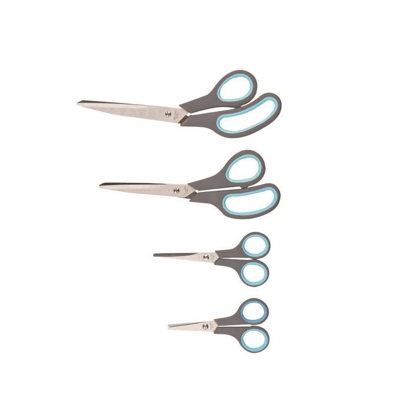 Sada čtyř nůžek: krejčovské nůžky (25 cm), nůžky pro domácnost (21 cm), nůžky na látky (14 cm) a nůžky pro řemeslníky (12 cm). Každé nůžky mají nastavitelný šroub a ergonomicky tvarované protiskluzové rukojeti s měkkými vložkami pro vysoký komfort při používání. Čepele z nerezové oceli zajišťují...