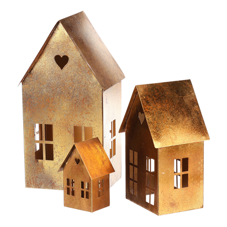 Svícen kovový - domek, barva měděná, cena za sadu 3 ks.