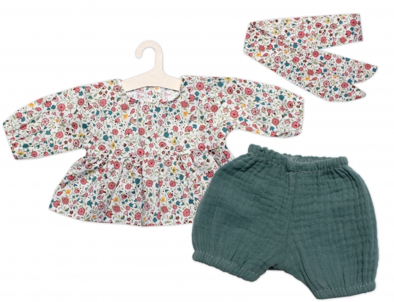 Oblečky pro panenky, tunika, kraťasky, šátek, Luční kvítky Alimi, zelená/smetanová