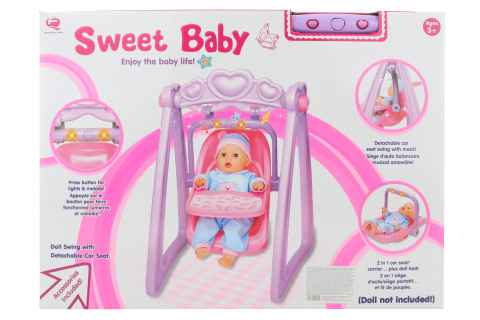 Houpačka pro panenky. Po vložení baterií houpačka vydává zvuky a svítí. Napájení na 2 AG13 baterie (jsou součástí). Houpačku lze sundat a použít jako autosedačku pro panenky. Houpačka je vhodná pro panenku o velikosti cca 45 cm. Panenka není součástí balení. Rozměry houpačky cca 40 x 57 x 34 cm.... číst celé