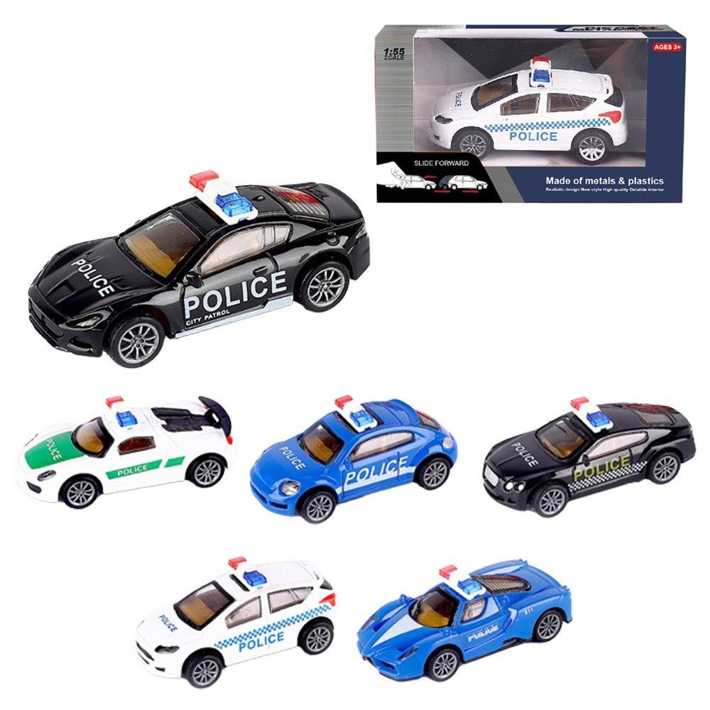 Samochód policyjny metalowy w skali 1:55 Napęd pull-back, 6 wzorów Auto 8.5x3.6x4 cm, wymiary opakowania: 12 x 4.5 x 6.5 cmMiks wzorów, towar wysyłany losowo. Cena za sztukę. číst celé