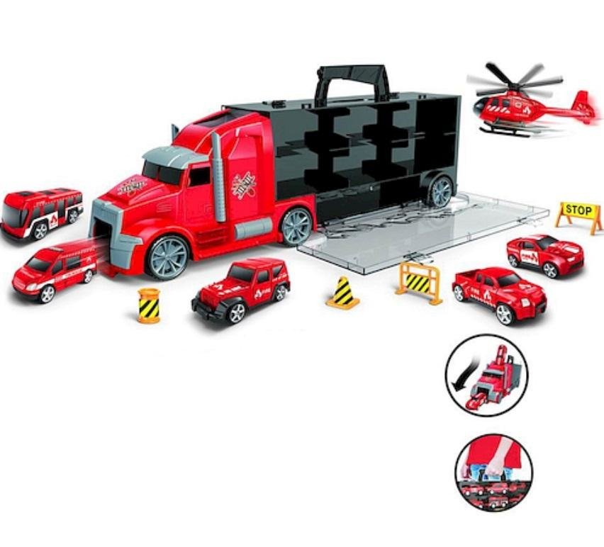 "WALIZKA ZESTAW POJAZDÓWZestaw autek w wygodnej walizce w kształcie ciężarówki.Każde auto posiada w walizce osobną przegrodę a kabina ciężarówki może służyć jako wygodny wyjazd by ruszyć do zabawy.Walizka jest zamykana i posiada wygodną rączkę, która umożliwi łatwe spakowanie i przenoszenie po...