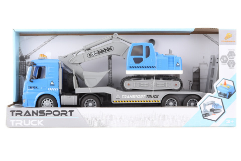 Plastový kamion s bagrem na baterie. Svítí a vydává zvuky. Rozměr kamionu cca 41 x 13, rozměr bagru cca 26 x 13 cm. Rozměr balení cca 48 x 20,5 cm. Věk 3+ číst celé