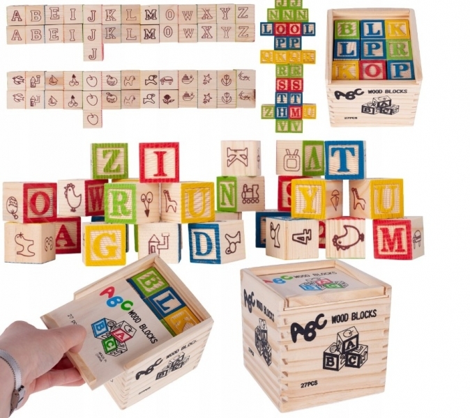 Dětské barevná dřevěná hra.Dřevěné kostky 27 ks s písmeny, čísly a obrázky + dřevěná krabička. Skvělé barevné kostky, ze kterých můžete vytvářet různé konstrukce, jsou ideální pro učení čísel a písmen. Můžete z nich vytvářet různá slova, sčítat a odečítat čísla.Na každém bloku najdete různé...
