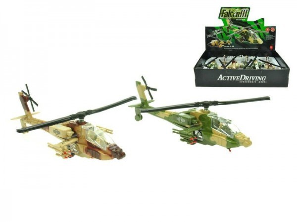 Vrtulník vojenský kov/plast 20cm zvuk světlo na baterie na zpětné natažení asst 2 barvy 6ks v boxu