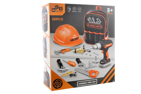 Sada nářadí v látkovém batohu. Balení obsahuje batoh, helmu, pilku, šroubovák, šupléru, kladívko, vrtačku na baterie (napájení na 2xAA baterie, které nejsou součástí balení) a menší doplňky jako např. šroubky - celkem 28 ks. Materiál plast. Baleno v krabici. Rozměry balení cca 26x30x11 cm. Věk 3+ číst celé