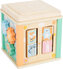 Kostku můžete díky odnímatelnému vrchnímu víku také snadno uložit dovnitř obráceně, což je skvělé do menších prostor. Design kombinuje vzhled dřeva s moderními pastelovými odstíny a roztomilými zvířecími motivy, které děti okamžitě zaujmou a podnítí jejich kreativitu i smyslové vnímání.