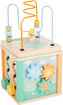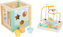 - Dřevěná motorická kostka s perličkovým bludištěm, ozubenými kolečky a otvory pro vkládání tvarů