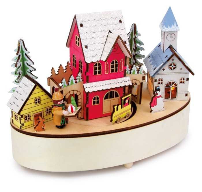 Při melodii „Tichá noc“ jezdí vláček poklidným městečkem kolem domků osvětlených malými žlutými světélky LED. S velkým množstvím drobných detailů představují tyto hrací hodiny pozoruhodný umělecký objekt. Dodání bez baterií.Německá firma Legler zaměřená na výrobu kvalitních dřevěných hraček od...
