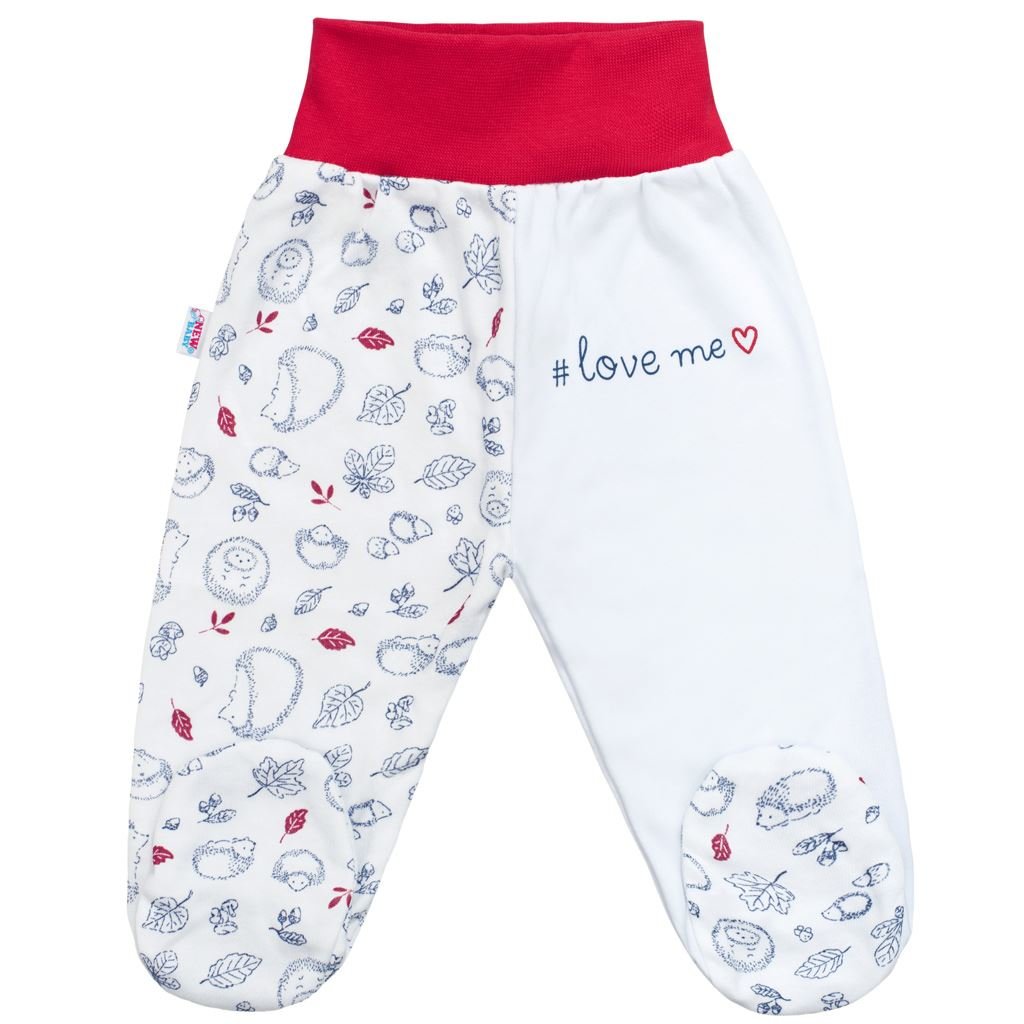 Bavlněné kojenecké polodupačky New Baby Hedgehog pro miminka. Jsou zdobeny širokým barevným pásem, potiskem s roztomilými ježečky, barevnými lístečky a nápisem love me. Široký stahovací pás netlačí na bříško miminka. Pro New Baby je velmi důležitá spokojenost zákazníka a právě proto vám nabízíme...