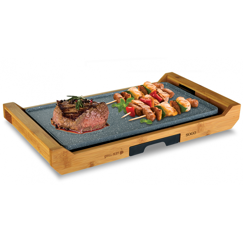 Stolní gril s GRANITOVÝM povrchem, který je nepřilnavým a odolný proti poškrábání. Deska 43 x 23 cm - s horkou zónou o průměru 15 cm a o 20 °C vyšší teplototu pro dokonalé a rychlé vaření. Ideální pro použití jako gril nebo japonská varná deska Teppanyaki. Integrovaný bambusový podnos. Teplotně...