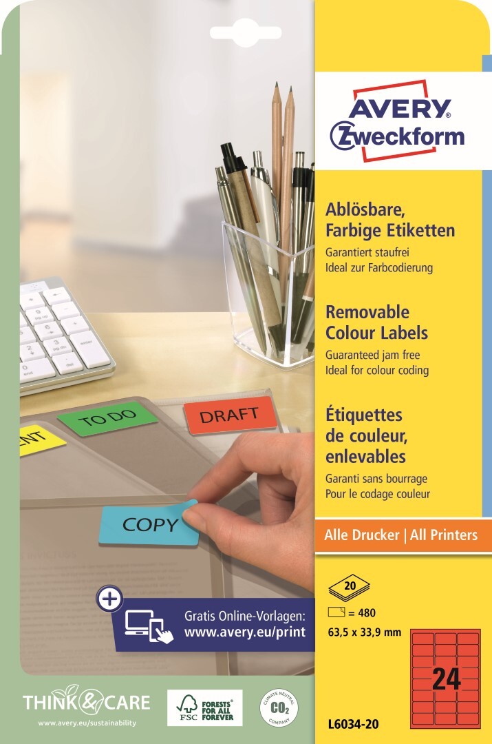 Avery Zweckform L6034-20 Barevné etikety 63,5 × 33,9 mm, 480 ks, 20 archů A4, červené, snímatelné